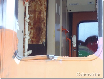 Las ventanas del tren han sido apedreadas. Esta corresponde a una de las puertas, obsérvese la mancha de grasa del interior.